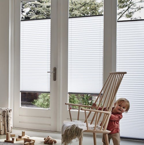 Thanks to the handle operation, the system is also safe for babies, young children and pets.A wide range of colour and fabric finishes are available from the 25mm Plissé collection.
